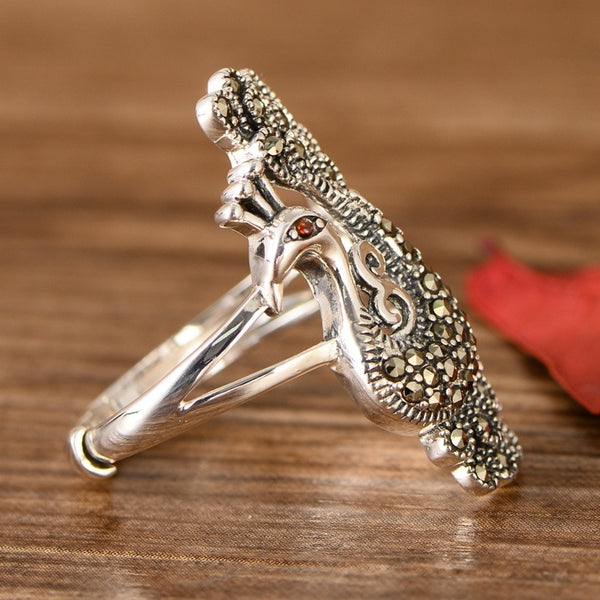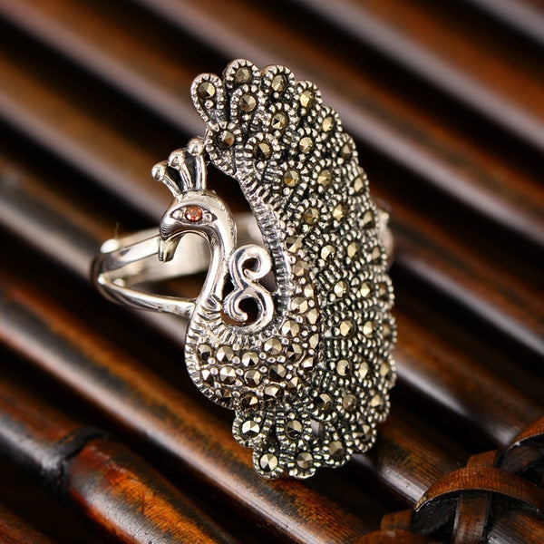 Silver Peacock Adjustable Ring - (S925 - Sterling Silver)