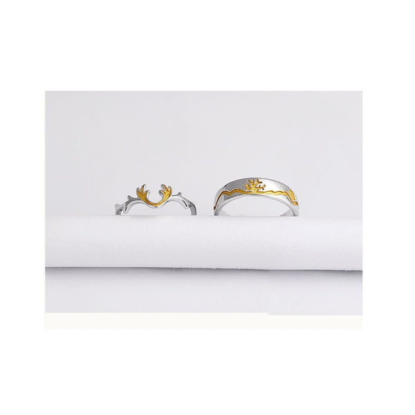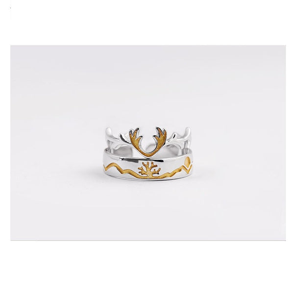 Sterling Silver Antler and Forest Couple Ring - (S925 - Sterling Silver)